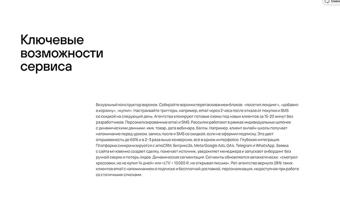 Визуальный конструктор воронок. Собирайте воронки перетаскиванием блоков: «посетил лендинг», «добавил в корзину», «купил». Настраивайте триггеры, например, email через 2 часа после отказа от покупки и SMS со скидкой на следующий день. Агентства клонируют готовые схемы под новых клиентов за 15-20 минут без разработчиков. Персонализированные email и SMS. Рассылки работают в рамках индивидуальных цепочек с динамическими данными: имя, товар, дата вебинара, баллы. Например, клиент онлайн-школы получает напоминание перед уроком, запись после и SMS со скидкой, если не оформил подписку. Это дает открываемость до 60% и в 2–3 раза выше конверсию, всё в одном интерфейсе. Глубокая интеграция. Платформа синхронизируется с amoCRM, Битрикс24, Meta/Google Ads, GA4, Telegram и WhatsApp. Заявка с сайта мгновенно создает сделку, помечает источник, уведомляет менеджера и запускает онбординг без ручной сверки и потерь лидов. Динамическая сегментация. Сегменты обновляются автоматически: «смотрел кроссовки, но не купил 14 дней» или «LTV > 10 000 ₽, не открывал письма». Pet-агентство вернуло 28% таких клиентов email с напоминанием о подписке и бесплатной доставкой, персонализация, недоступная при работе со статичными списками.